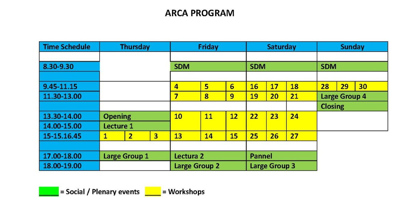 The LG Teams: 1. LG: A team of 4 conductor teams who will rotate - an Art Project Large Group run by Wilma Scategni/Italy, Anna Varnai, Maria Bingöl/Turkey and Ukraine and Violeta Goldman/Serbia and US , 2. LG: Marcia Karp/GB & Jorge Burmeister Petullá/Spain and Switzerland, 3. LG: Mario Buchbinder/Argentina 4. LG: Maite Pi and Judith Teszary
